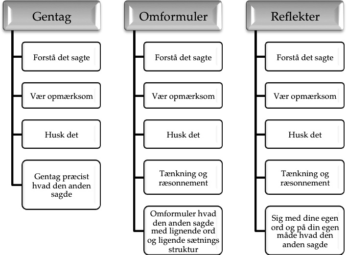 Du kan supplere gentagelsen, omformuleringen eller refleksionen med: