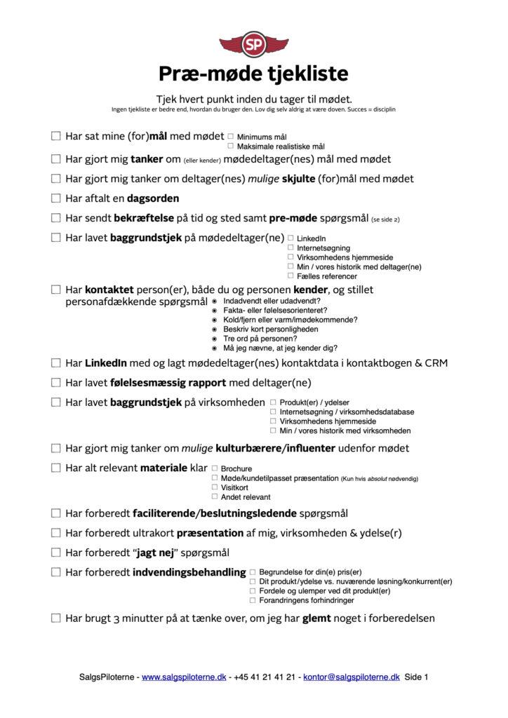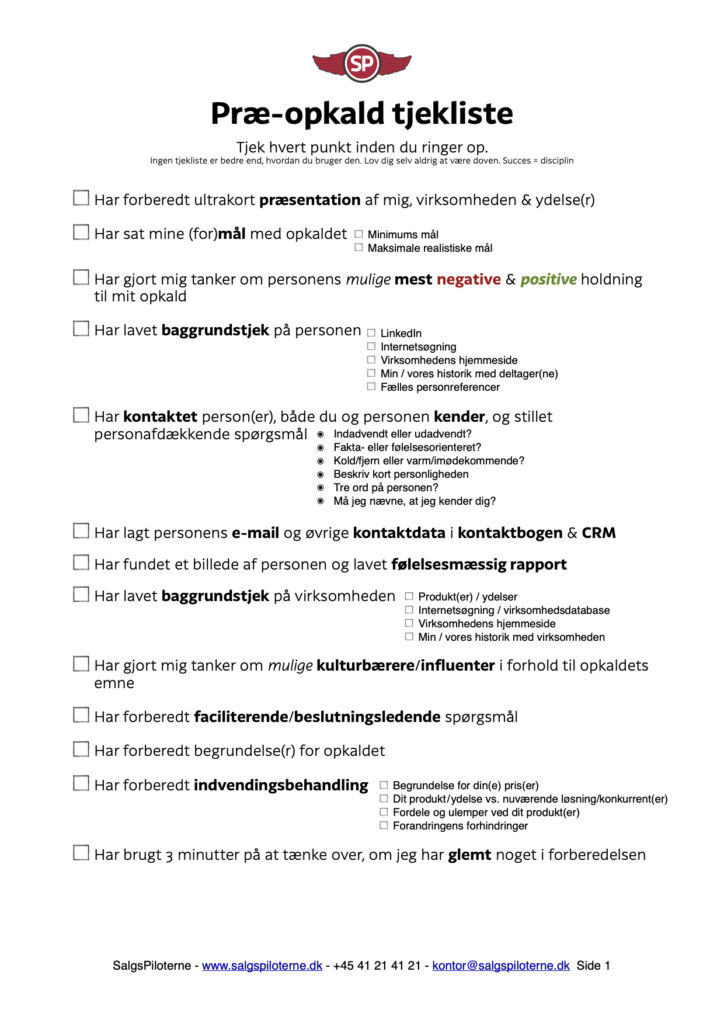 Som Zig Zigler siger i ovenstående citat: “Mangel på retning er problemet, aldrig mangel på tid. Vi har alle 24 timer i døgnet!”. Din klare retning er at få en hurtig afklaring på kundens parathed til at gøre noget andet end status quo. Din tid er kostbar, og du skal aldrig spilde den på møder, du kunne have være foruden. Vil du have et værktøj, der kan hjælpe dig, både på telefonen og i selve mødet? Hent nedenstående tjeklister. De kræver på nogle punkter mere forklaring, end der er plads til her, men hellere give dig værktøjerne uden forklaring, end intet at give dig: