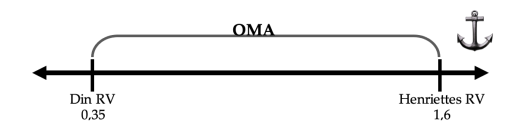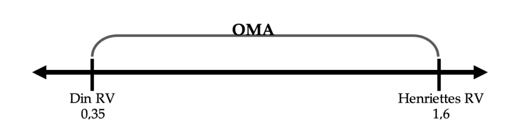 Her ser du også faren ved at starte med at byde. Du havde beregnet OMA forkert. Henriettes RV er langt højere, end du forventede. Hvis du tror, at modpartens RV er lavere, end den faktisk er, risikerer du at lægge dit anker indenfor OMA, og dermed brænder du penge, du aldrig får igen.